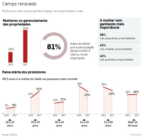 Os anos recentes não foram só de ganho de produtividade e aumento do uso da tecnologia no campo. Ele também ficou mais feminino. Uma em cada três propriedades rurais do País tem mulheres ocupando funções de comando – há cinco anos, eram 10%. Quando não são as principais responsáveis pelas propriedades, elas atuam como administradoras, dividem as atividades com um familiar ou estão sendo preparadas para assumir essas funções.