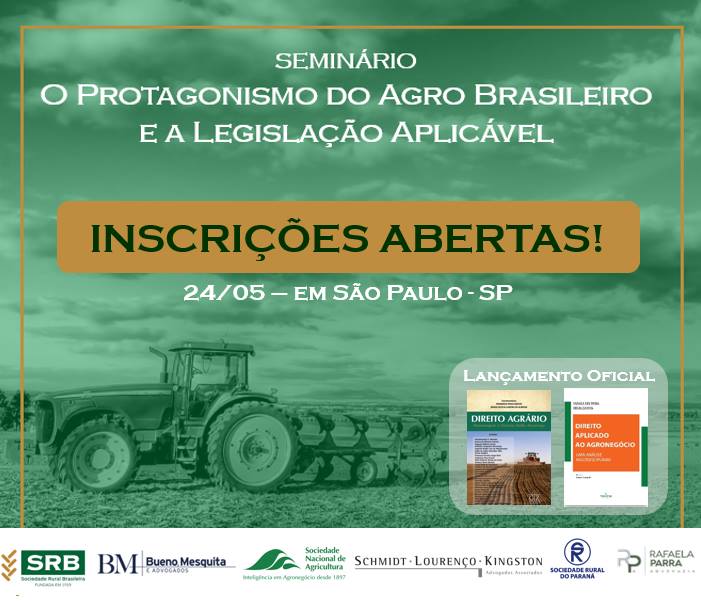 Inscreva-se: https://www.sympla.com.br/seminario-o-protagonismo-do-agronegocio-brasileiro-e-a-legislacao-aplicavel__283126